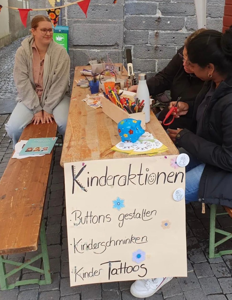 Mit dabei waren auch unsere katholische Kindertagesstätte und der Förderverein. Trotz windigem kühlen Wetter setzten sich die Erzieher den ganzen Tag hin und malten Kindergesichter an, pressten selbstbemalte Buttons und pinselten Tattoos auf kleine Kinderhände.