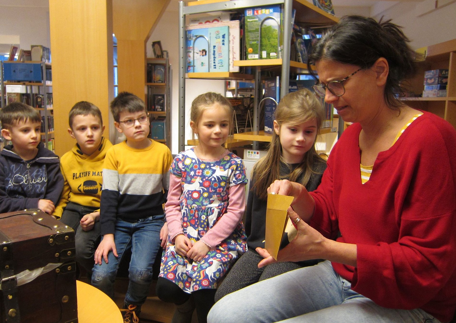 Am zweiten Besuchstag erwarteten die Kinder verschiedene Rätsel rund um das Thema „Märchen“. Zunächst wurde in der gesamten Bücherei ein Schatz gesucht. Oben auf einem Regal versteckt, stand eine riesige Schatzkiste. Diese wurde genau unter die Lupe genommen. Darin befanden sich viele Märchenbücher und eine verhexte Märchen-Geschichte. Die Kinder lösten insgesamt vier Rätsel, um später zu echten Büchereipiraten, mit einer Urkunde gekürt zu werden.