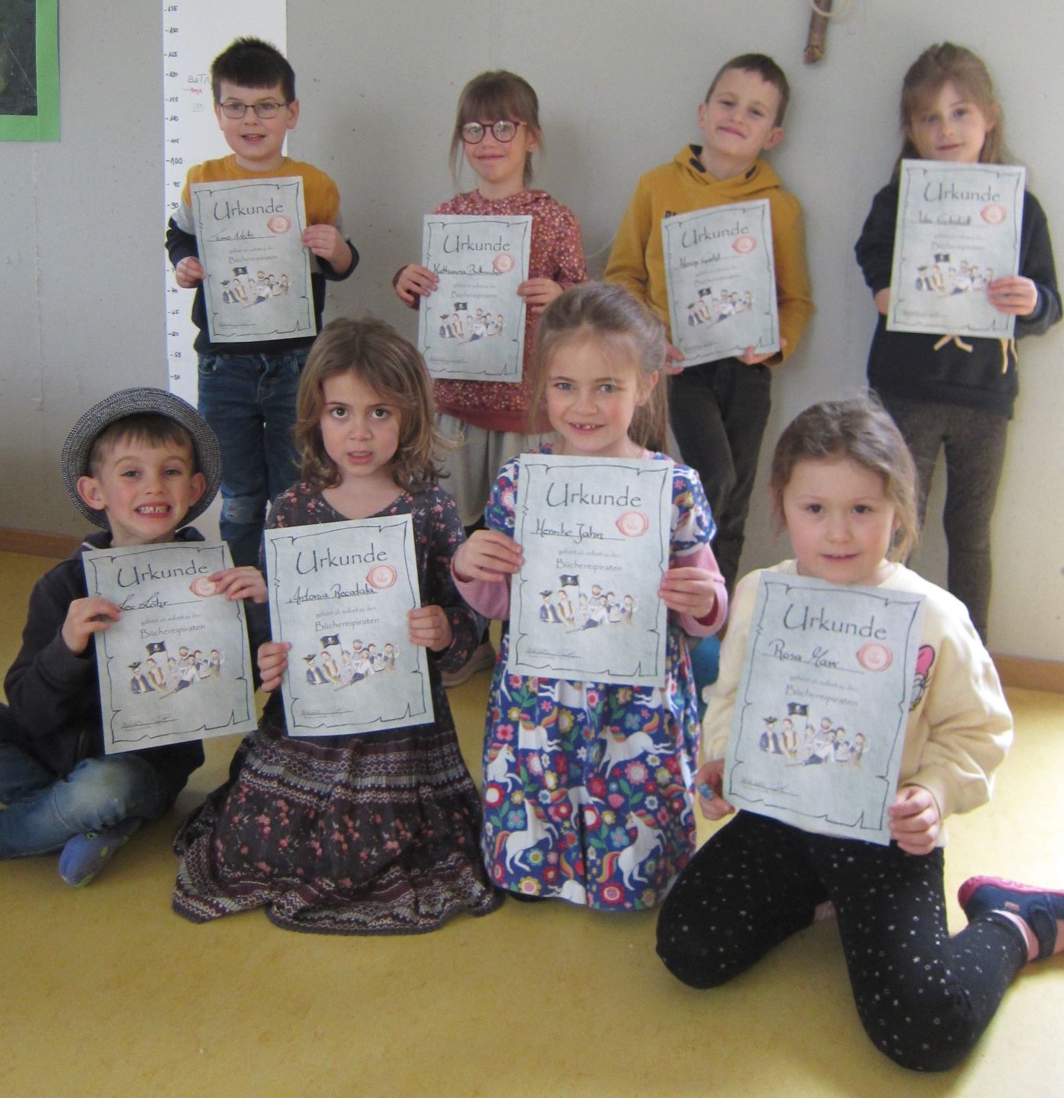Begrüßt wurden sie von Tanja, einer Mitarbeiterin der Bücherei, die sie zunächst einmal durch die Räume führte. Danach wurde erläutert, was alles in der Bücherei ausgeliehen werden kann, wie eine Ausleihe funktioniert und wie die Besuchsregeln sind. Im gemeinsamen Stuhlkreis wurde anschließend der Geschichte um den Piraten Schorchi gelauscht. Es folgten weitere spannende Piratenspiele und eine Piraten-Bücher-Suche!