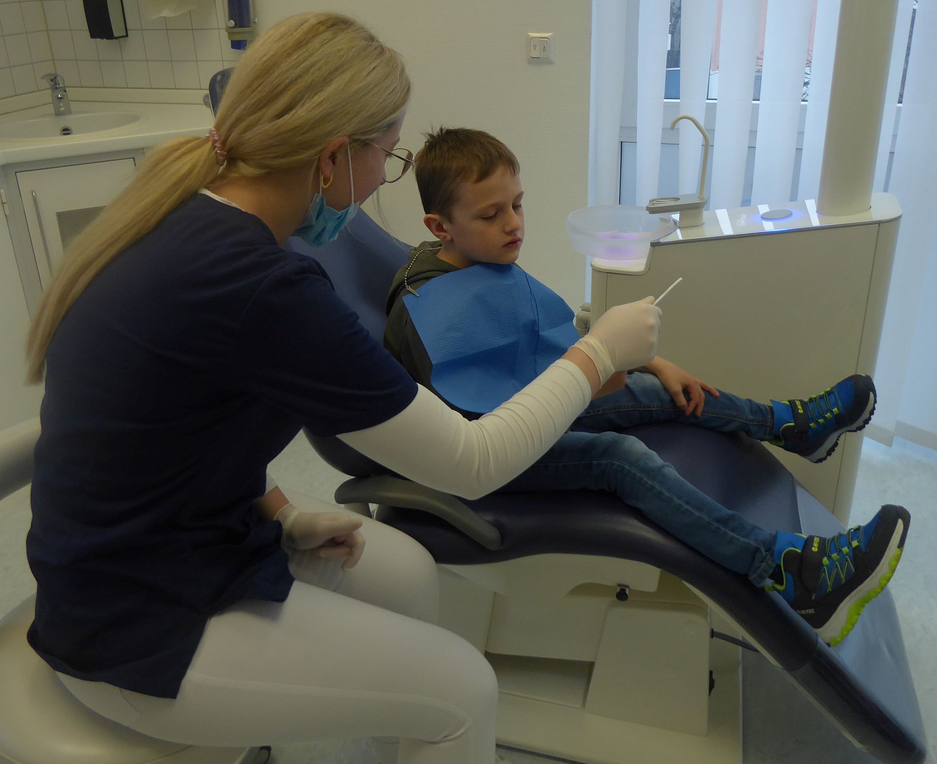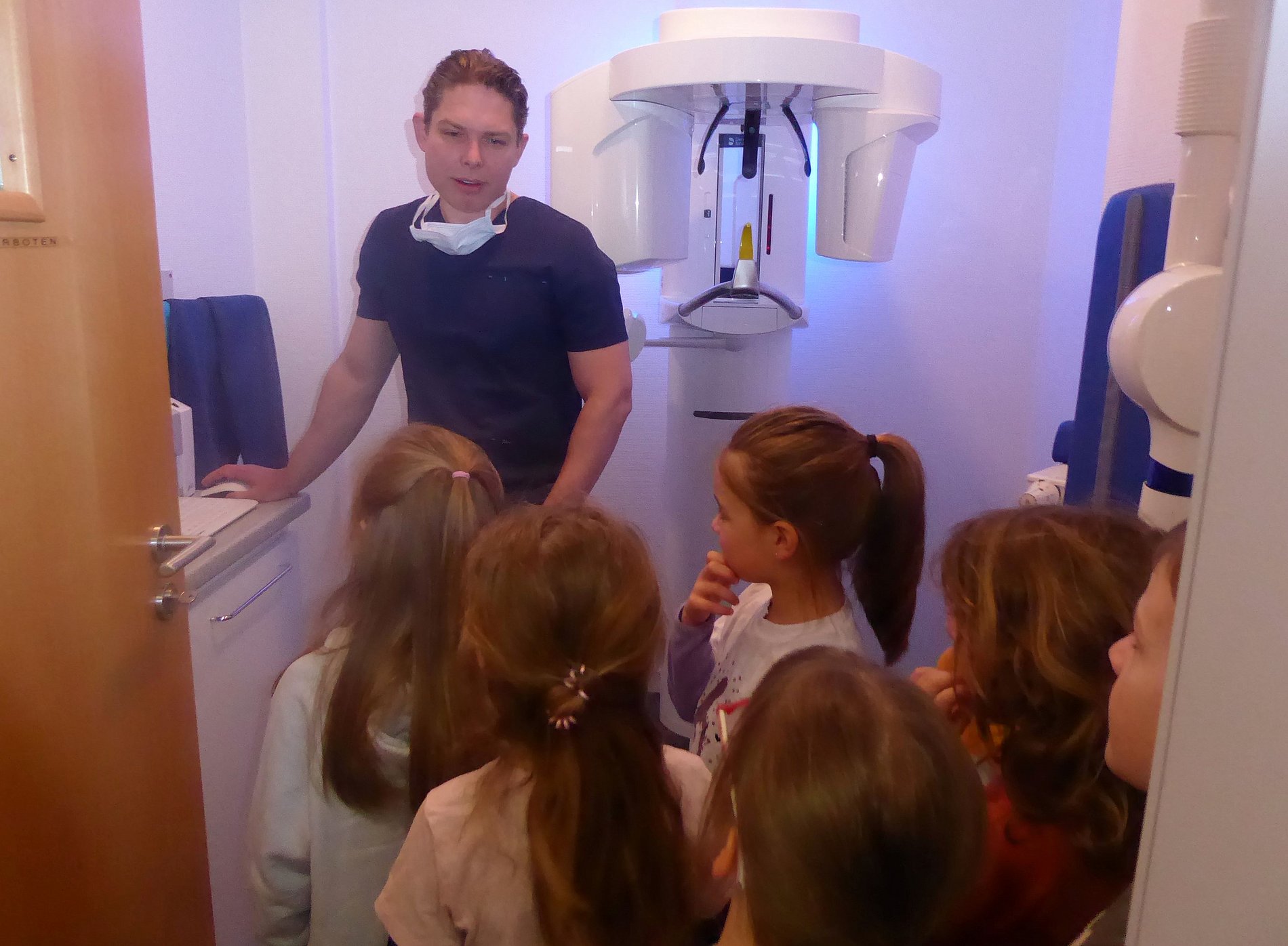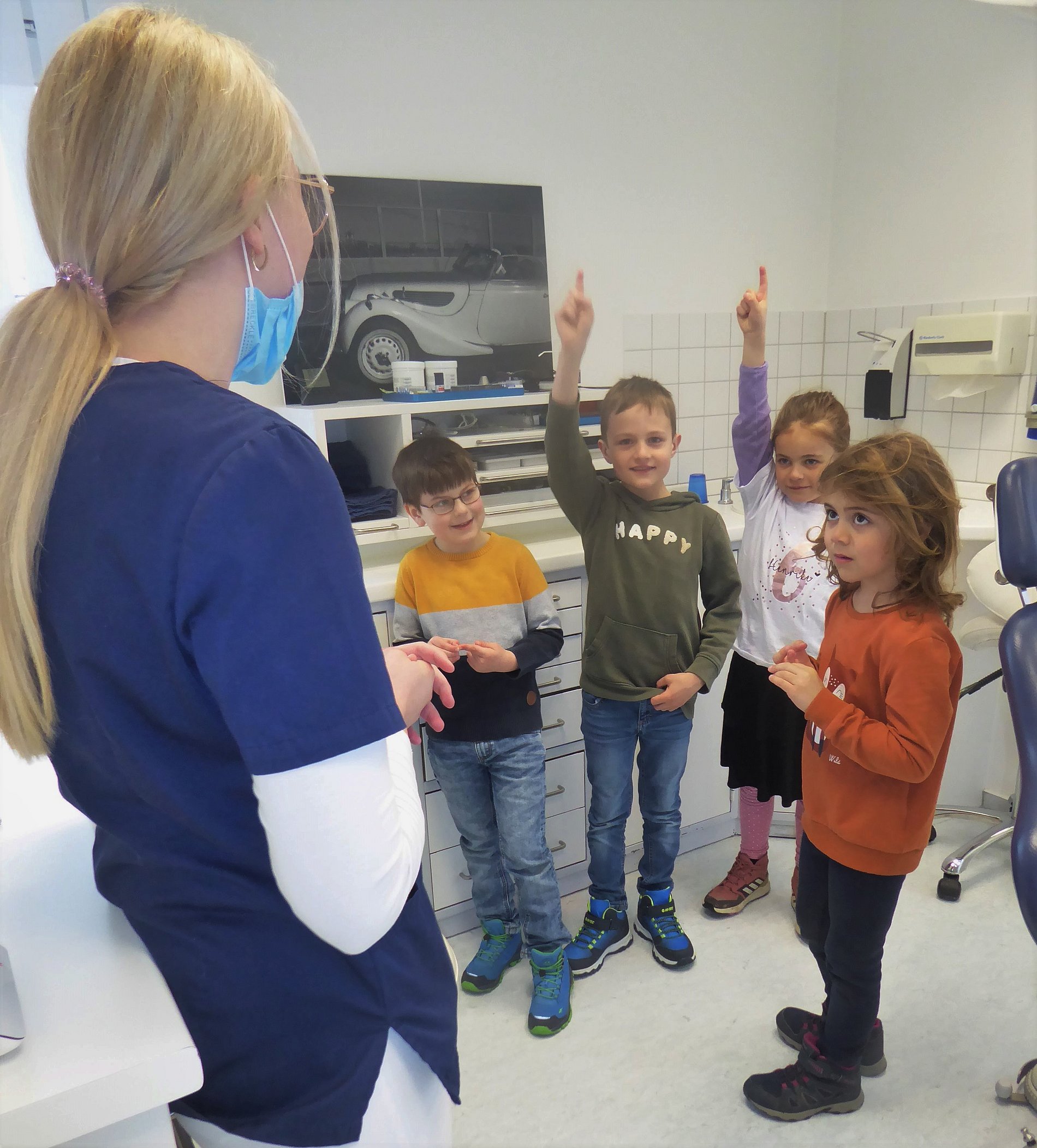Am Montag, den 17. April 2023 haben unsere Vorschulkinder die Zahnarztpraxis von Dr. Schretzmair in Hachenburg besucht. Nachdem die Kinder an der Anmeldung begrüßt wurden, ging es auf direktem Wege in die Behandlungszimmer. Dort durfte jedes Kind auf dem Behandlungsstuhl Platz nehmen und die verschiedenen Funktionen ausprobieren. Mit einem Mini-Spiegel wurde gezeigt, wie der Zahnarzt die Zähne kontrolliert und wie weit der Mund dabei geöffnet werden muss. Danach erklärte Dr. Schretzmair das Röntgengerät und zeigte lustige Fotoaufnahmen auf einem großen Bildschirm. Im Anschluss war Ida sehr mutig und ließ sich durch die medizinischen Fachangestellten ihre Zähne färben und anschließend polieren. Als Erinnerung gab es eine Urkunde und einen Zahnputzbecher für zu Hause.