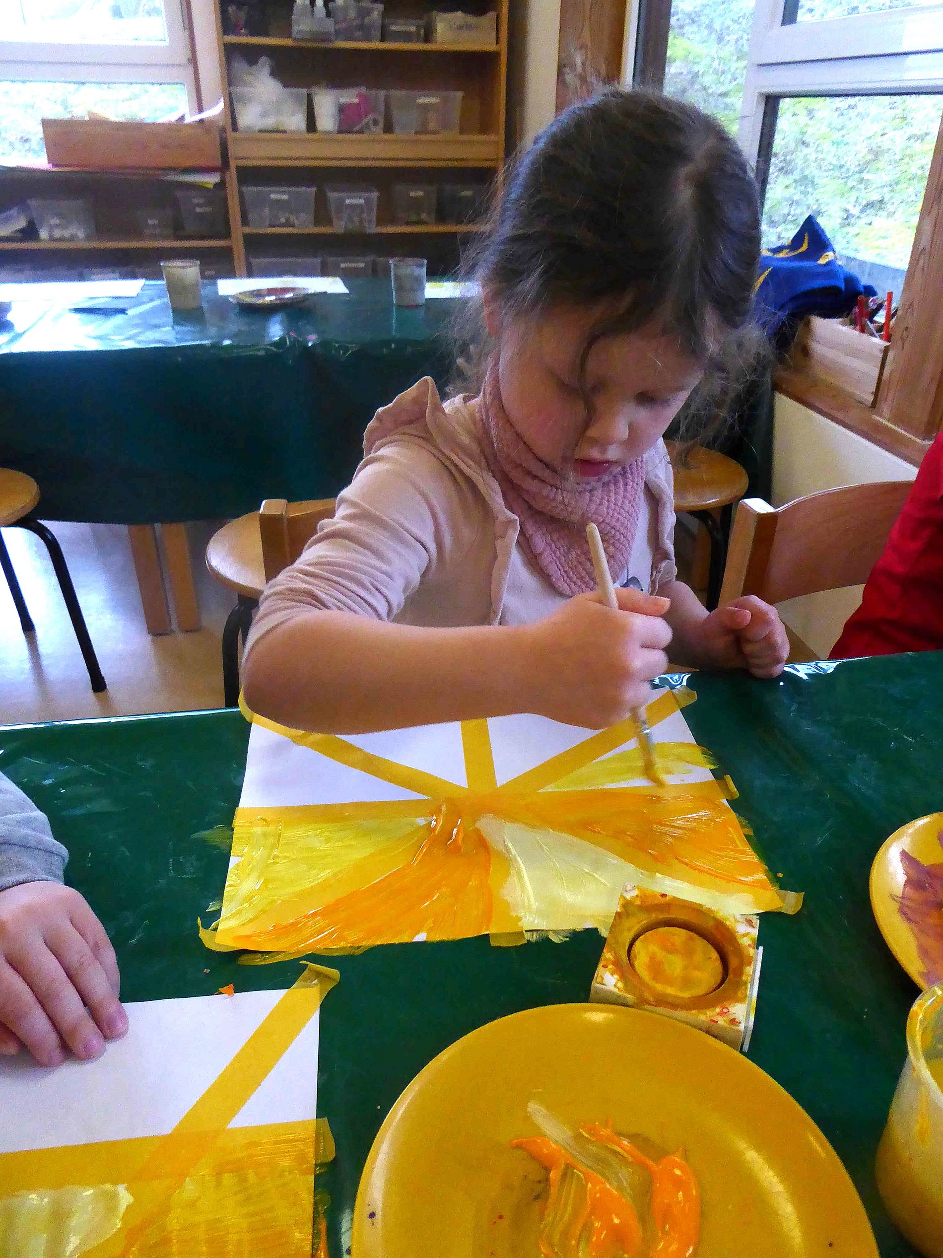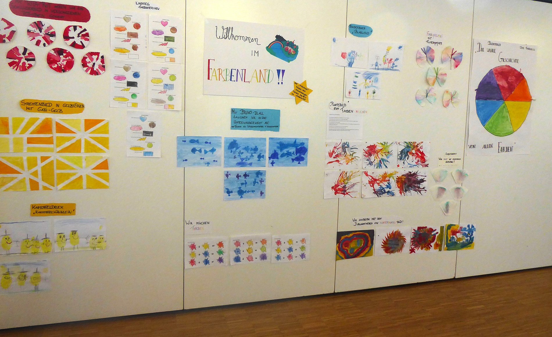 Die mittleren Kinder der Sternengruppe reisten in den letzten Wochen ins Farbenland. Dort wurden die drei Grundfarben Rita-Rot, Gabi-Gelb und Bruno-Blau kennengelernt. Diese Farben haben uns alles über ihre Farbenländer berichtet wie es dort aussieht, wie die Bewohner der einzelnen Länder aussehen und was sie ausmacht, wie sie wohnen und was sie am liebsten essen. Sie wissen wirklich sehr viel über Farben und haben uns alle unsere Fragen sehr geduldig beantwortet. Außerdem hat jede Farbe eine tolle neue Maltechnik mitgebracht, sodass die Kinder diese ausprobieren und selbst aktiv werden konnten. Dabei sind viele tolle Kunstwerke entstanden, die an der Turnraumwand bestaunt werden konnten.