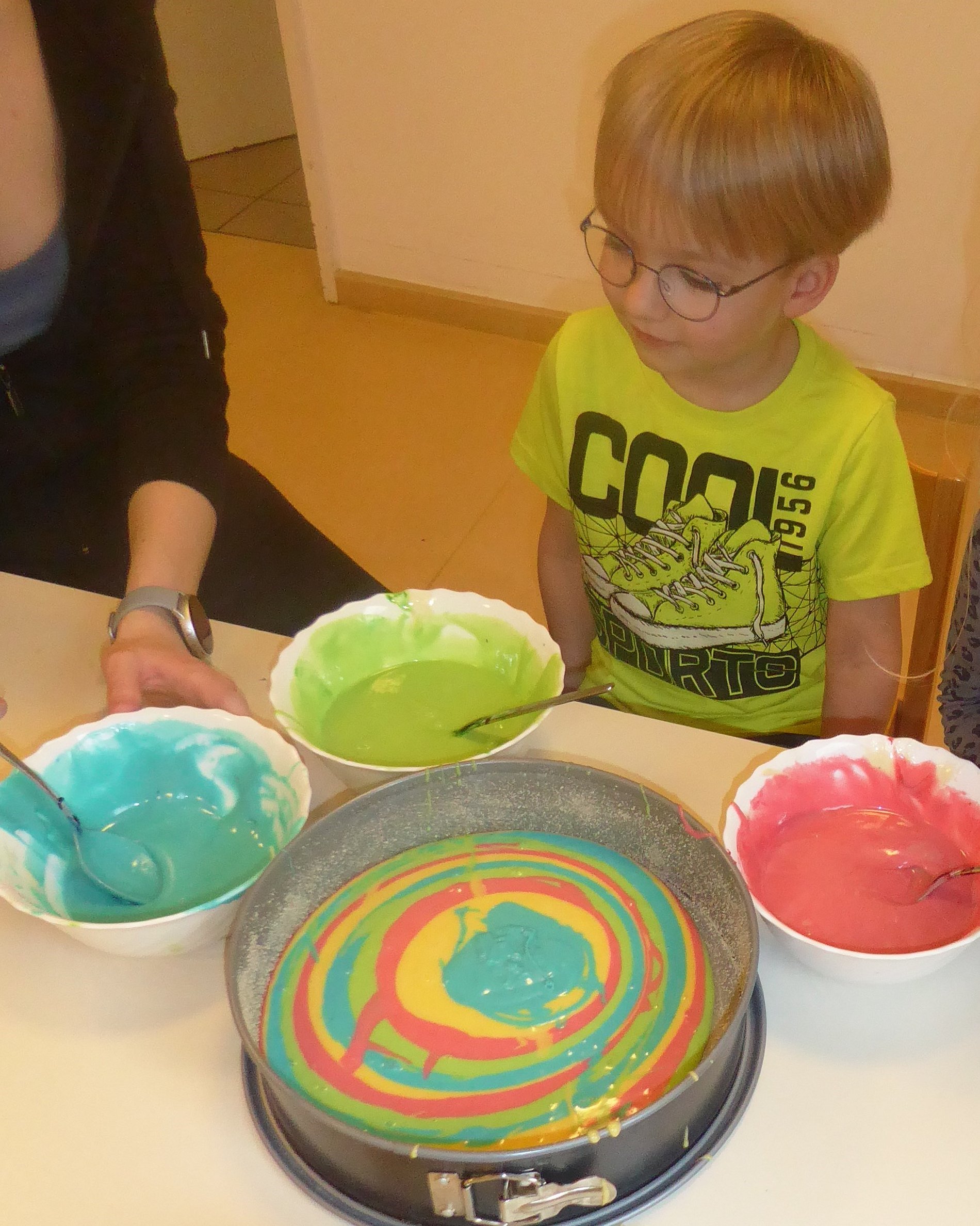 Zum Abschluss haben wir mit Farben geturnt und einen bunten Regenbogenkuchen gebacken. Dieser wurde am nächsten Tag mit allen Kindern aus der Sternengruppe zum Frühstück gegessen. Hierbei haben die Farbenlandkinder den Kindern von ihrer Reise ins Farbenland berichtet.